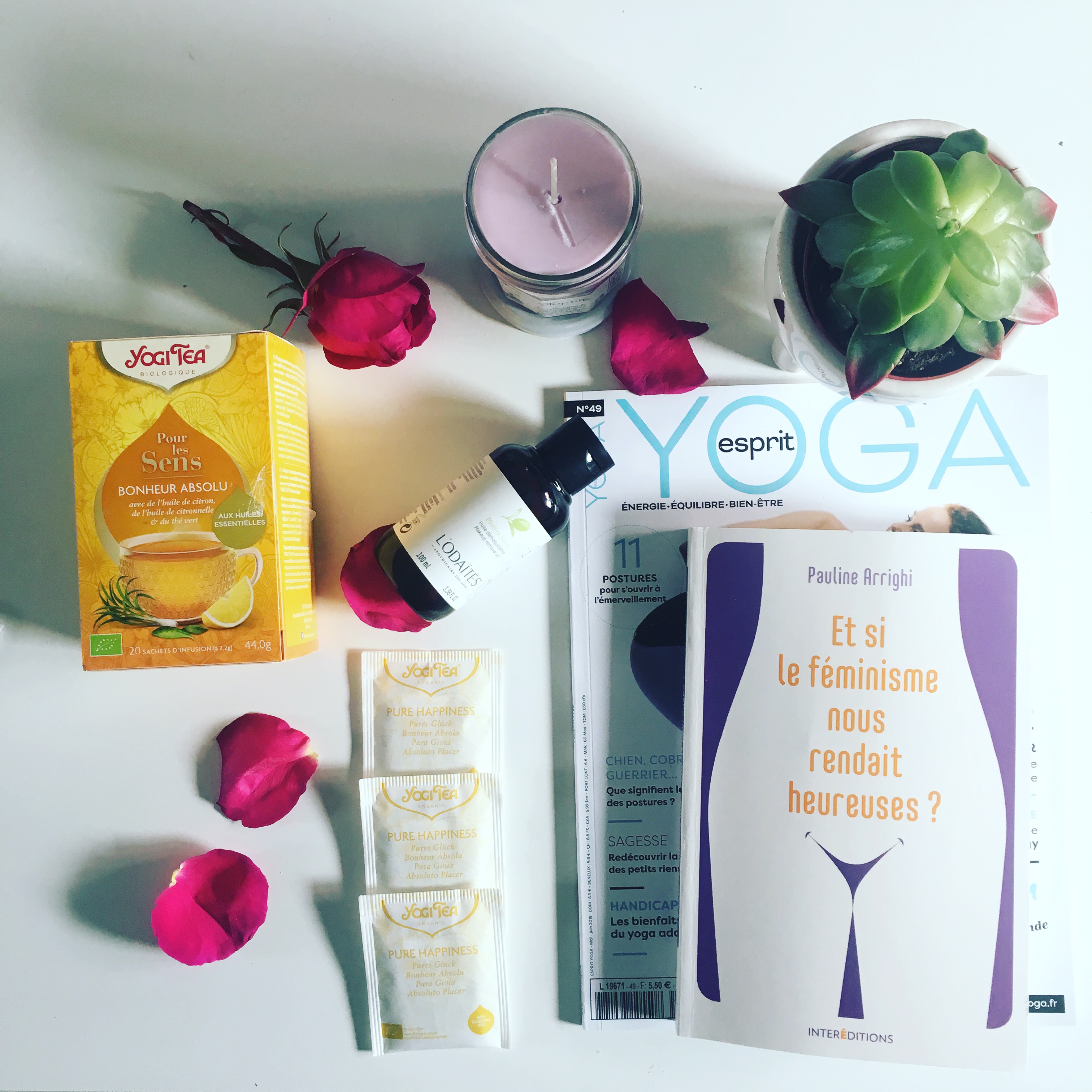 Avec le livre, le magazine Esprit Yoga, le thé Bonheur absolu aux huiles essentielles de Yogi Tea, le philtre sacré de l’Odaïtès et une très odorante votre bougie artisanale de Charroux !