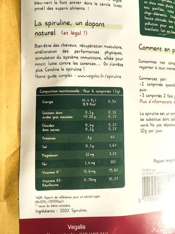 Le site Vegalia m’a envoyé de la spiruline à tester en cure, pour 30 jours sous forme de comprimés tout ronds (et assez gros ma foi, prévoir un bon verre d’eau pour faire passer !)