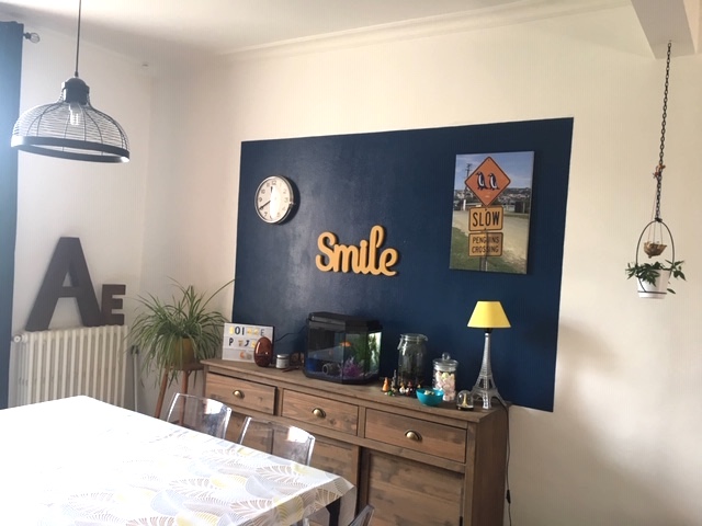On a eu du mal à choisir, parce qu’on voulait quelque chose de cohérent avec notre mur bleu de la salle à manger.