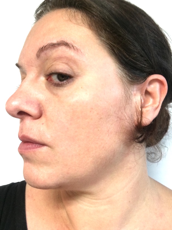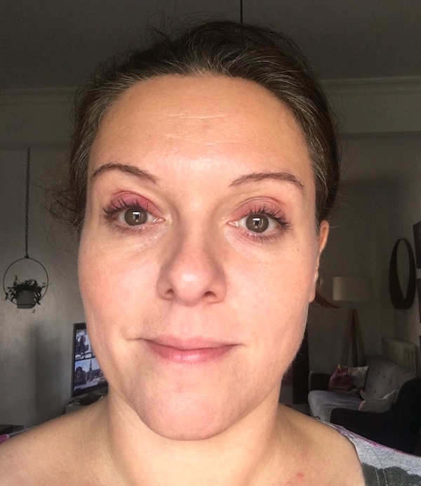 Pour l’après, on voit vraiment bien le résultat. Bon là , je suis maquillée mais comme tu vois, je mets très peu de maquillage… Je me maquille les yeux et j’applique un peu de poudre.
